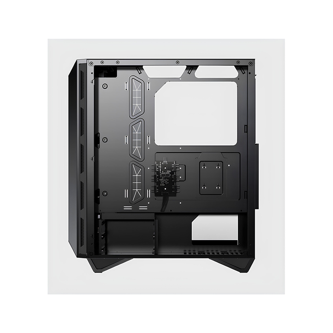 - Compatibilité étendue de cartes mères (ATX, Micro‑ATX, Mini‑ITX) et emplacement alimentation en bas pour une architecture de montage équilibrée.
